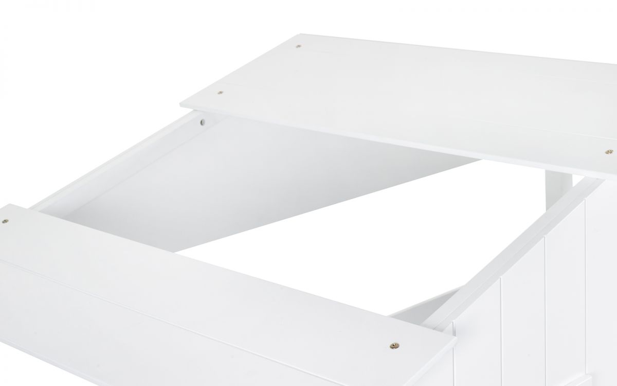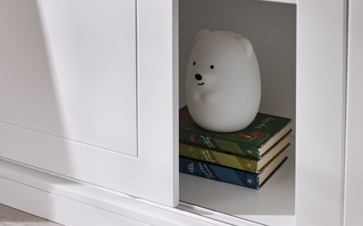 - Slide-door storage unit underneath provides great storage for toys and books.
