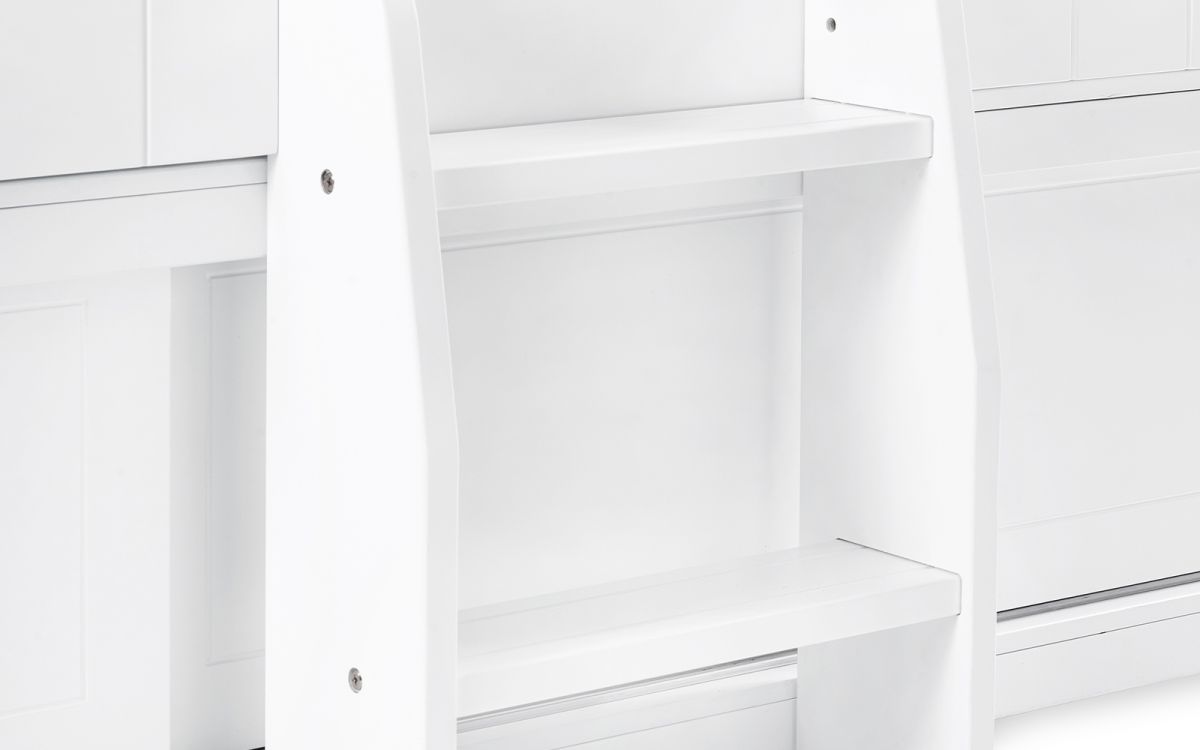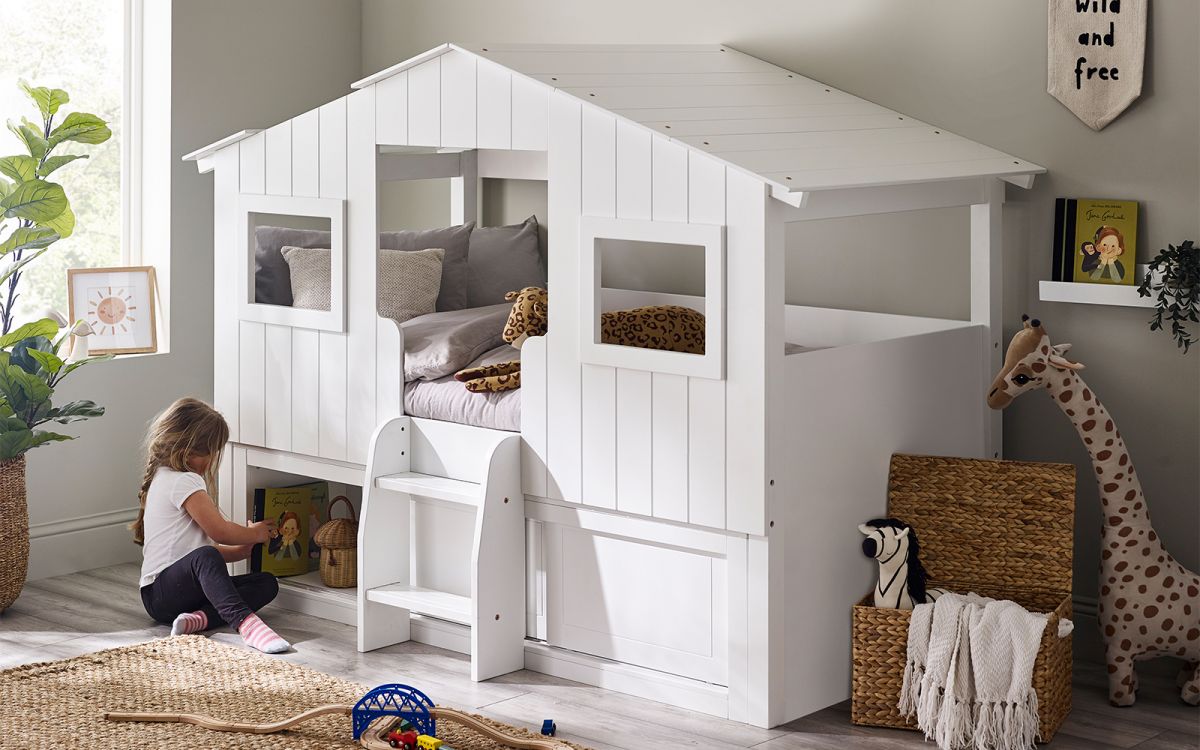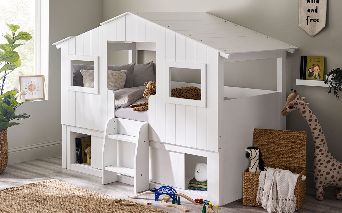 Step into a whimsical woodland wonderland with the Acorn Treehouse Midsleeper & Storage Unit, transforming your child's bedroom into an enchanting escape. This magical treehouse-style bed boasts a charming white panelled front and rooftop adorned with two square windows, sparking imaginative adventures. Watch as your little explorer climbs into their cosy retreat using the two small step ladder and gets lost in endless daydreams while peering out of the roof gap. Below awaits a slide-door storage unit, the perfect hideaway for stowing books and toys - ensuring a tidy and organised space.