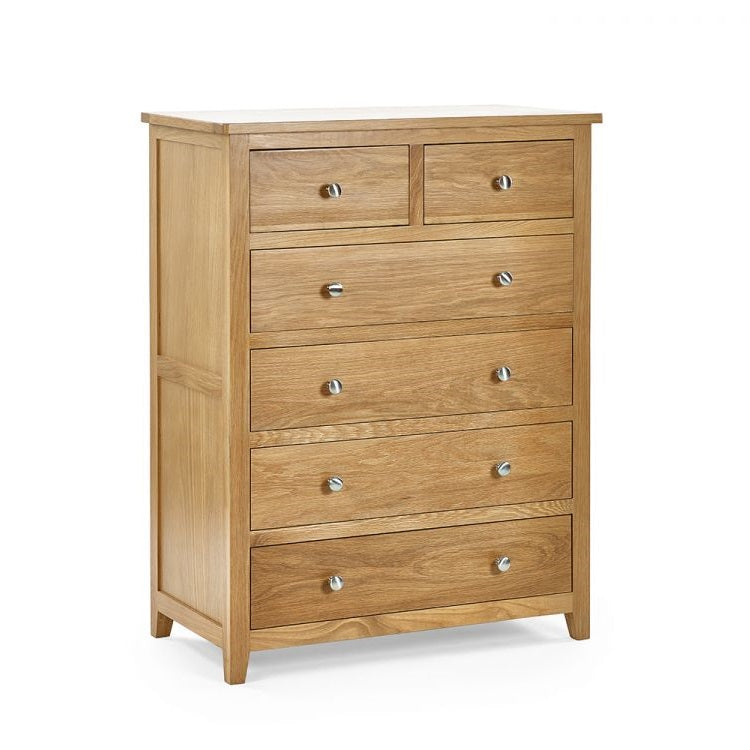The Mallory 4+2 Drawer Chest is crafted from solid oak and oak veneers ensuring long lasting durability. Featuring 2 small drawers and 4 larger drawers, the chest is ideal for keeping your clothing organised. The simple, yet stylish design finished with round silver knobs complements any bedroom decor.
