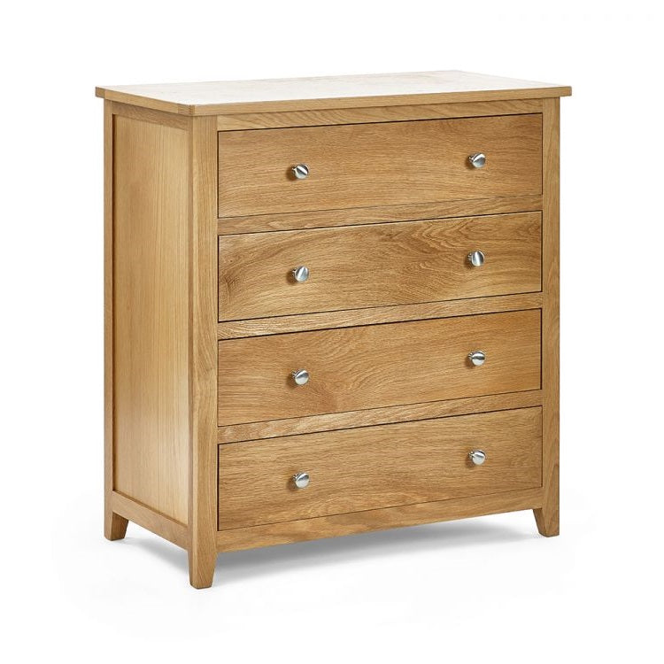 Crafted from solid oak and oak veneers, the Mallory 4 Drawer Chest features 4 generously sizes drawers ideal for storing clothing. The simple, yet stylish design with beautiful silver knobs perfectly complements any bedroom decor.
