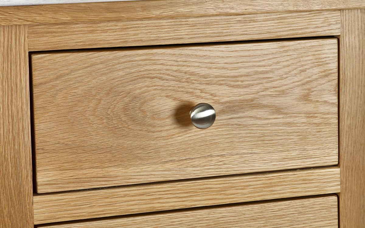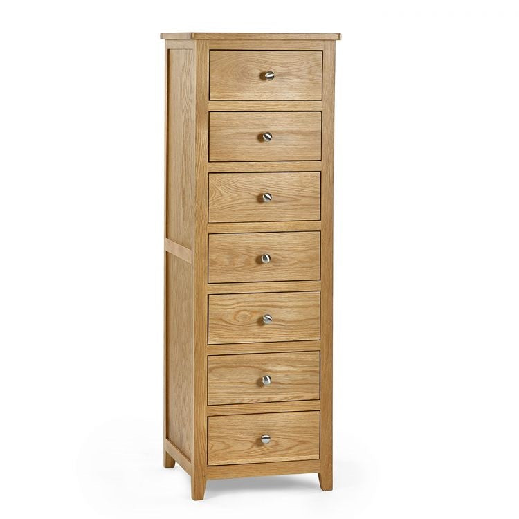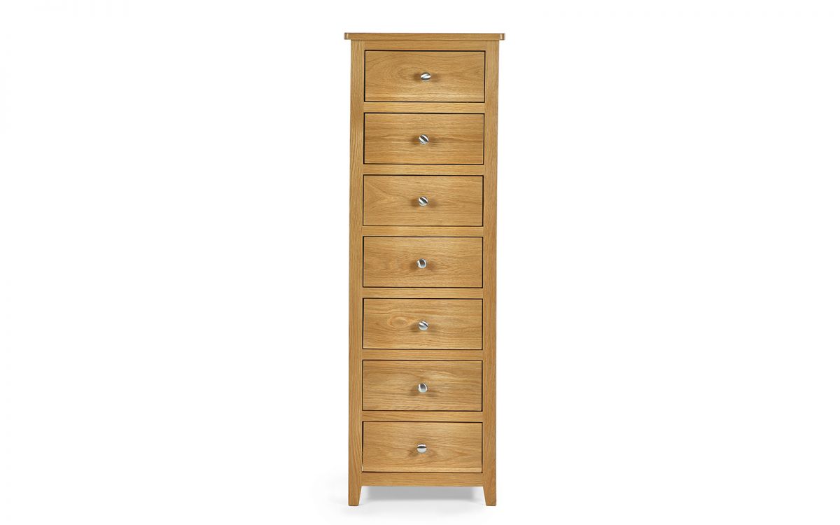Crafted from solid oak and oak veneers, the Mallory 7 Drawer Narrow Chest provides a simple and stylish storage solution for clothing and other items. Finished with beautiful round silver knobs, the chest perfectly complements any bedroom space.