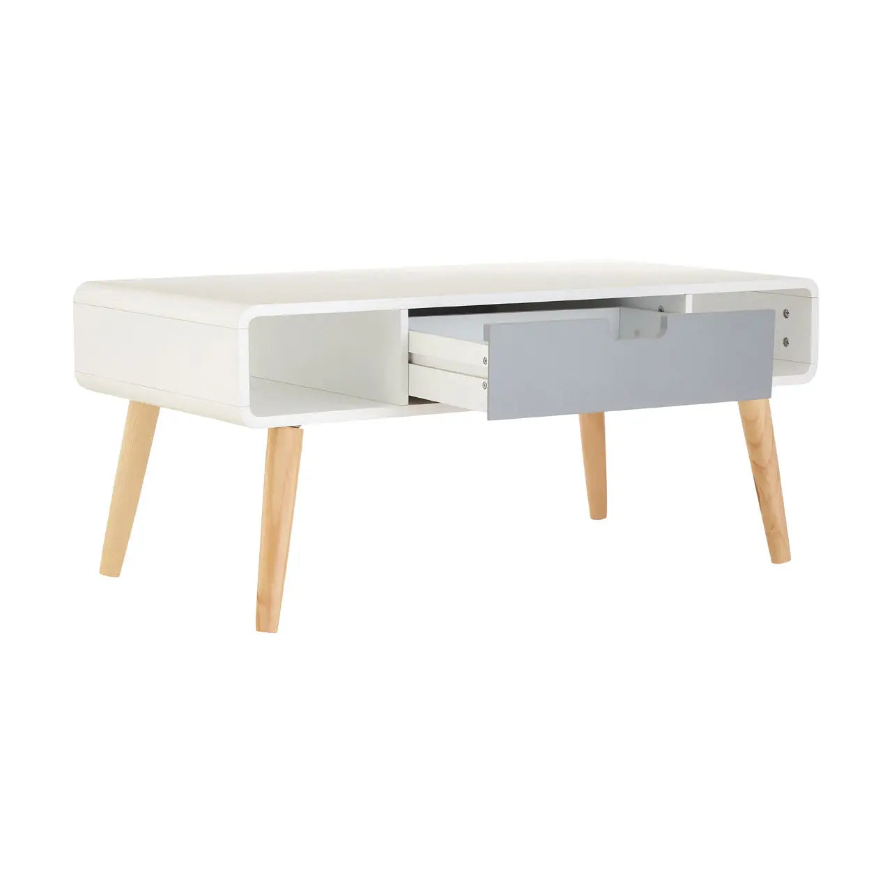 Its four angled legs are made from natural pine wood, with a warm gold tone and gentle grain that complement the table's muted white and grey hues. The rectangular table has rounded edges which soften the overall look. A central drawer provides space to store magazines and newspapers, while remote controls can be kept handy in the adjacent open shelves.