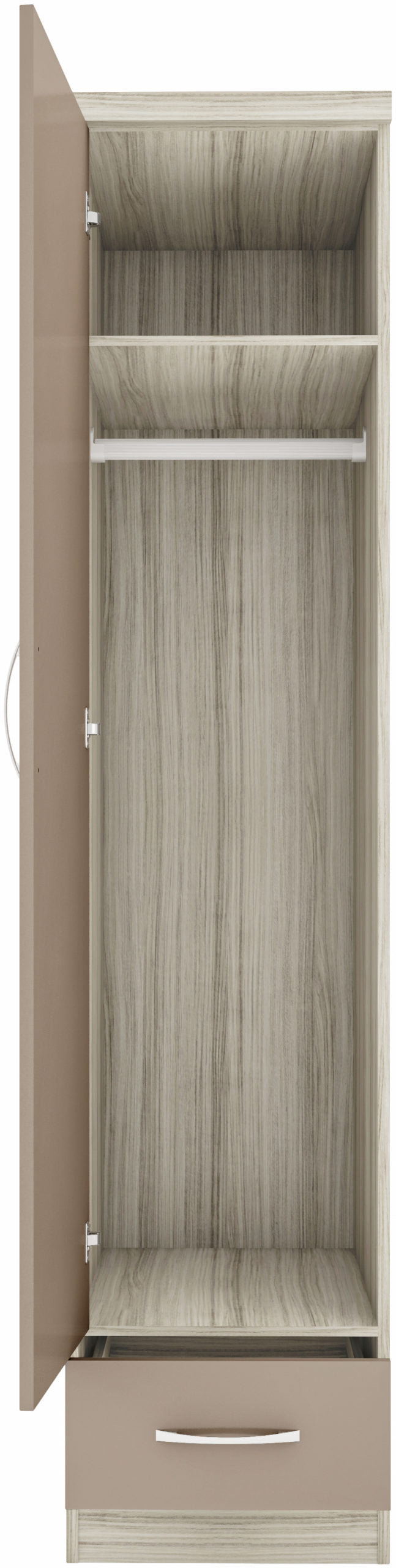 This luxurious wardrobe showcases impeccable craftsmanship, featuring a single door and a spacious drawer. Add a touch of elegance to your bedroom with the Nevada 1 Door 1 Drawer Wardrobe, perfect for storing your clothing and accessories. Experience the ultimate in organization and refined style.