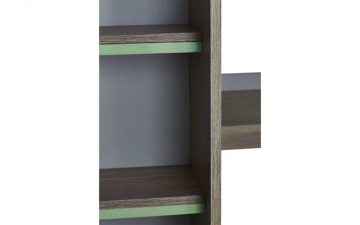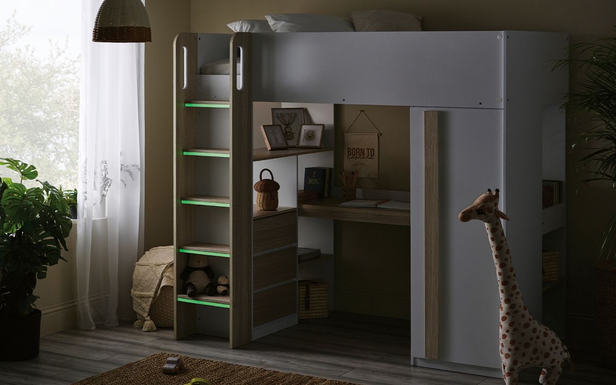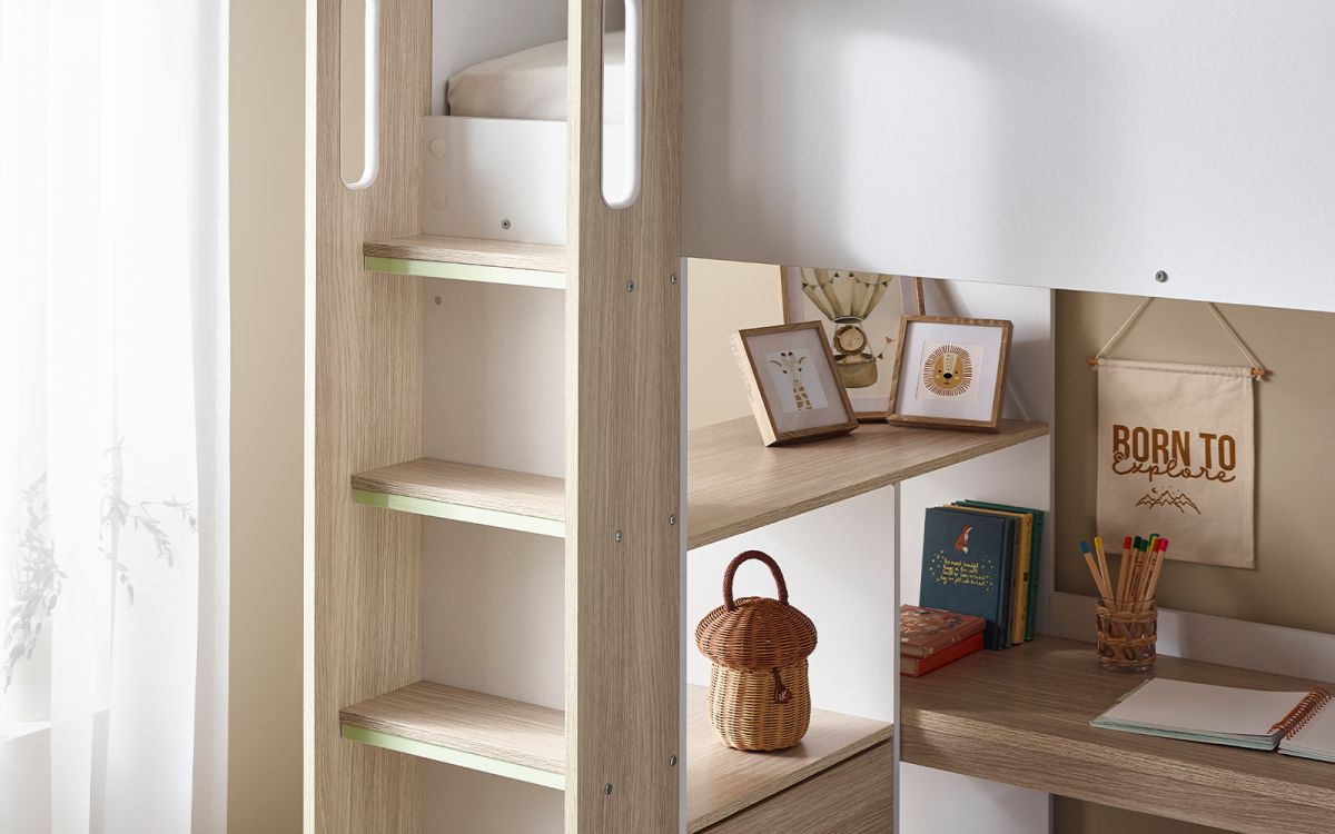 Crafted with precision and finished in a tasteful white and woodgrain effect, the Ocean Highsleeper boasts a versatile design that maximises every inch of space. This highsleeper features a practical desk which provides a dedicated workspace for homework or creative endeavours, with three convenient pull-out storage drawers that prevent cluttering and keeps essential items within arms reach. The built-in shelving units are ideal for showcasing items or organising books, and the one-door wardrobe offers a discreet and space-efficient solution for clothes. The glow-in-the-dark steps are a perfect addition - not only do they add a playful touch, but they enhance visibility during the night for your younger ones.