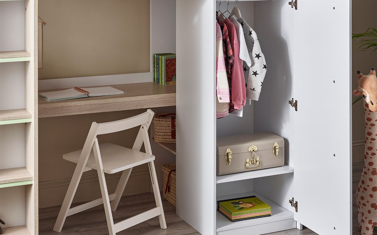 - Features a desk, three pull-out storage drawers, a one-door wardrobe, and built-in shelving units