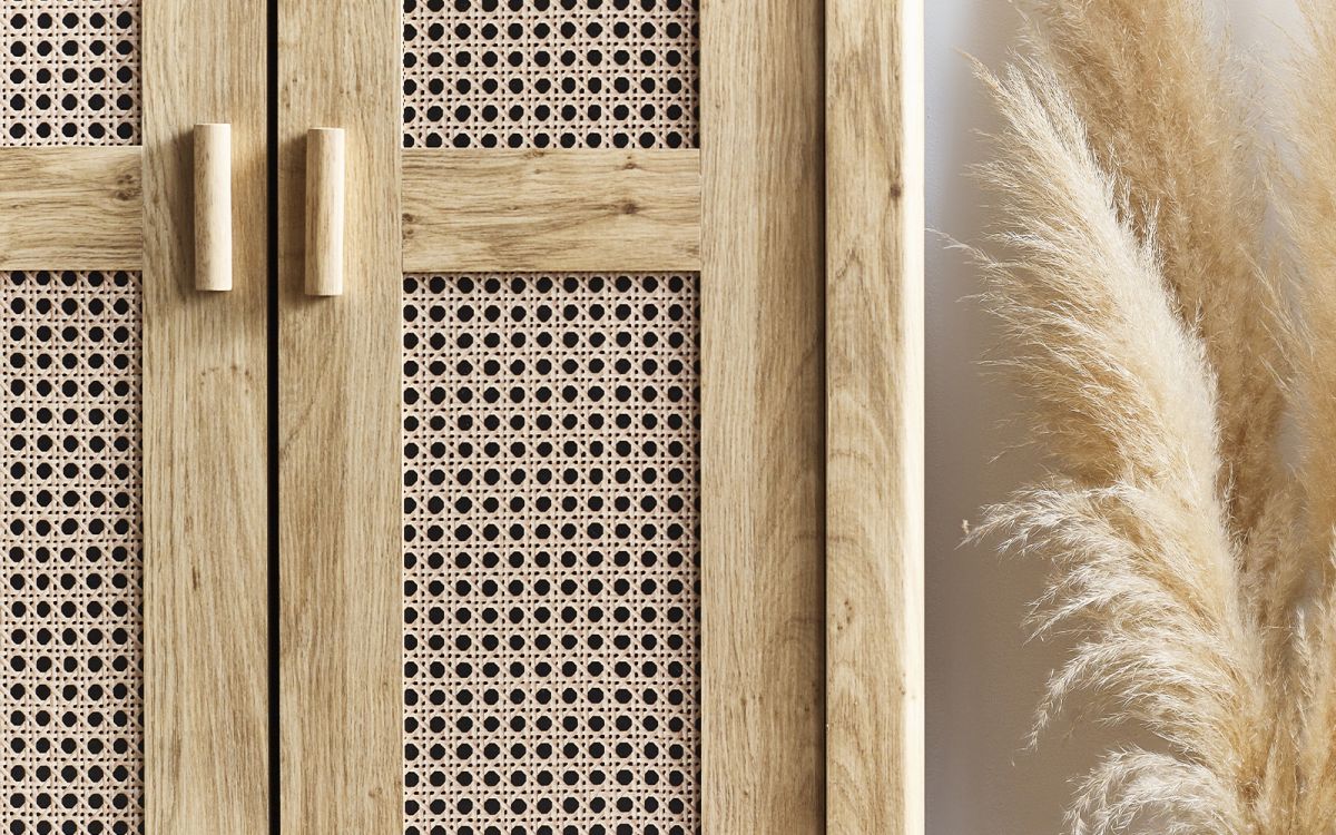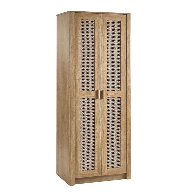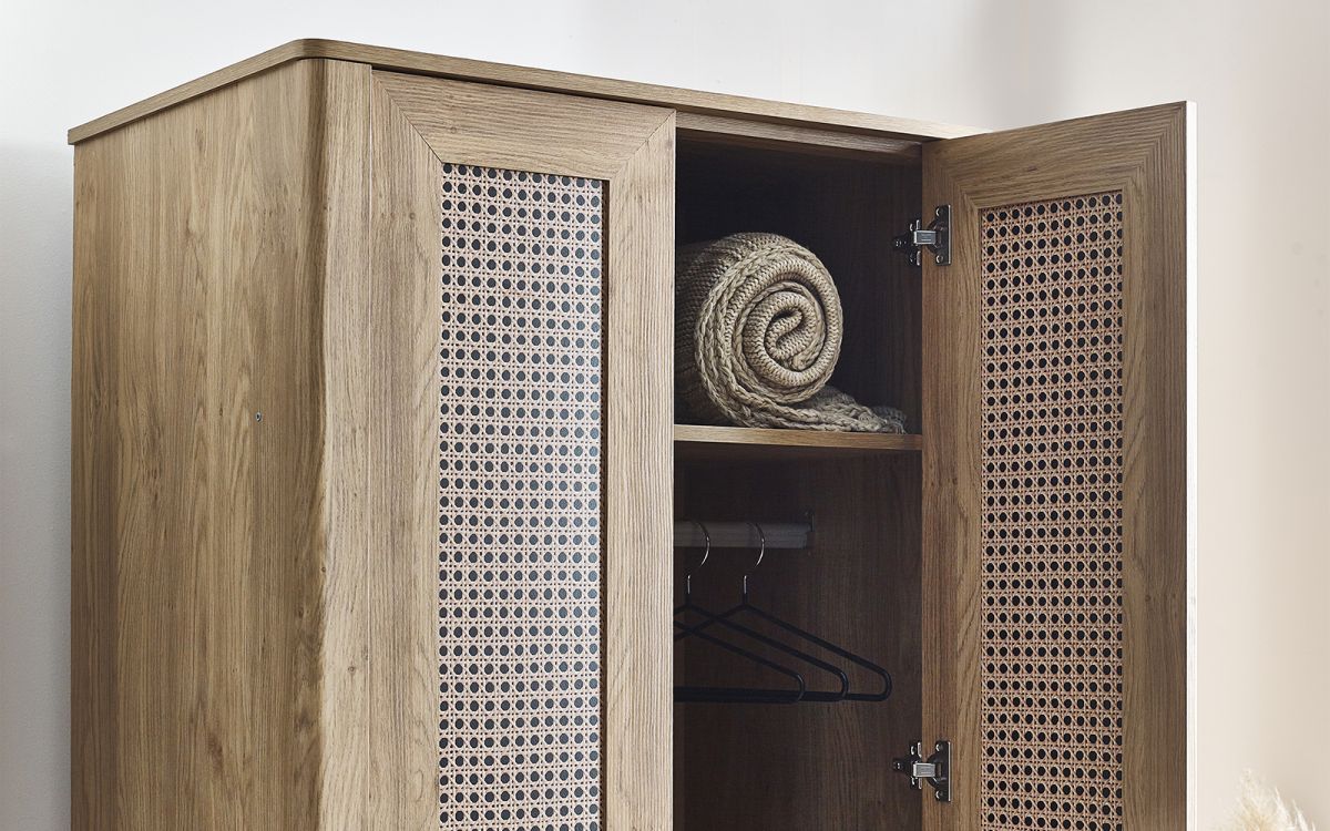 A beautifully sleek design with a bohemian feel, the Sydney 2 Door Wardrobe offers exquisitely curved edging accompanied with a rattan-styled front. Finished with a natural oak effect featuring a double door design, providing plenty of hanging space for your clothes and belongings. Creating the perfect airy, warm feel within your home.