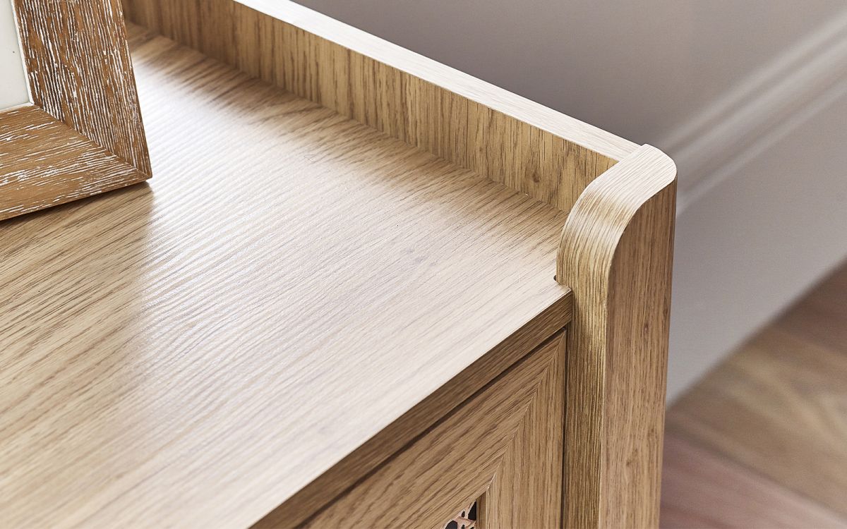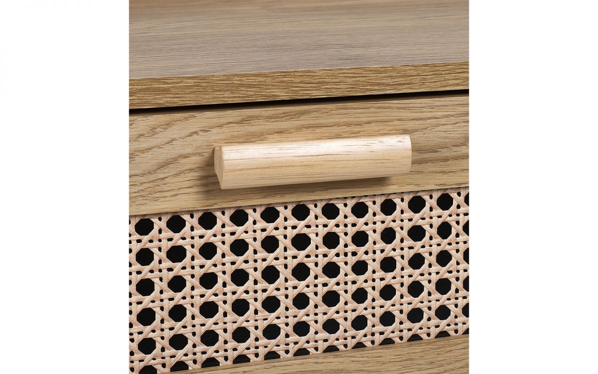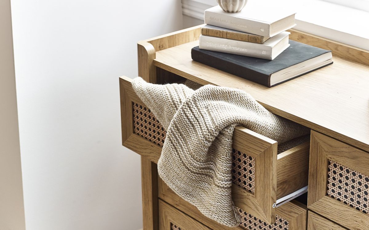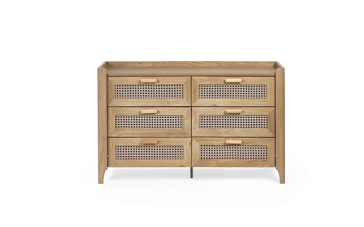 A beautifully sleek design with a bohemian feel, the Sydney 6 Drawer Wide Chest offers exquisitely curved edging accompanied by a raised lip around the edge providing a practical addition, stunningly combined with a rattan-styled front. Finished with a natural oak effect featuring six wide drawers providing the ideal storage space for any bedding or clothing items plus extra space on top for ornaments to be placed. Creating the perfect airy, warm feel within your home.