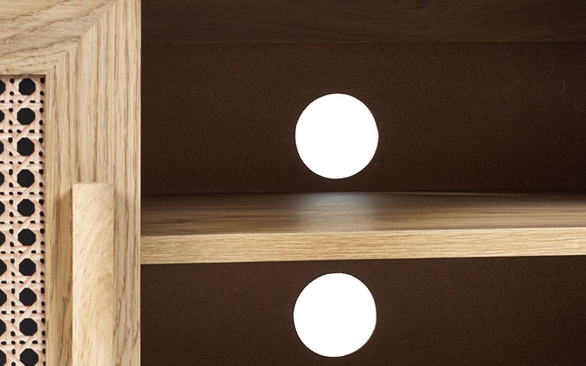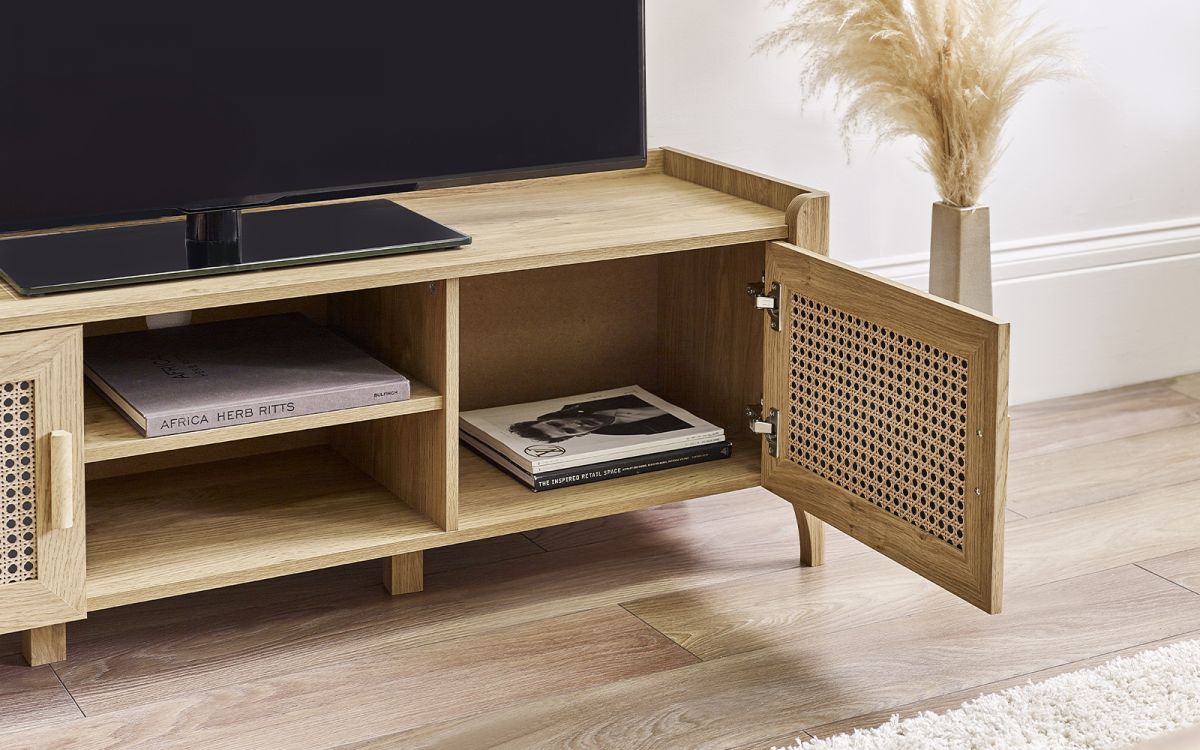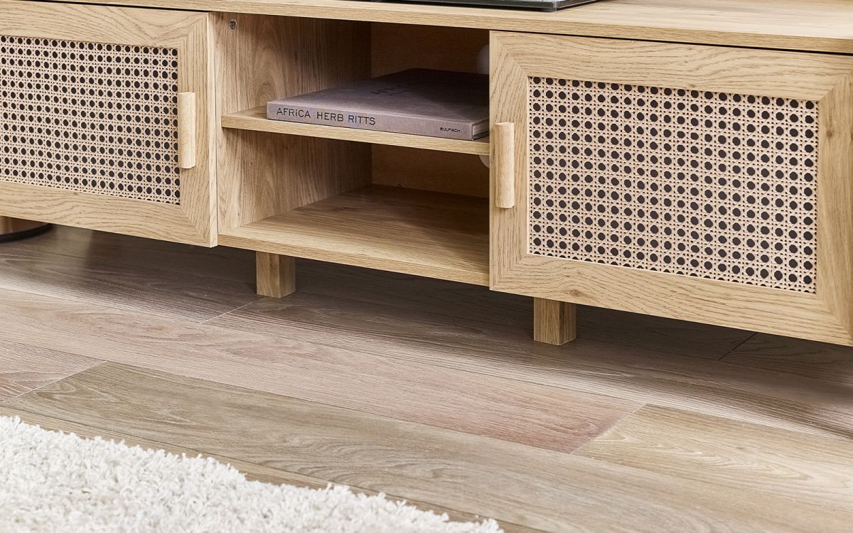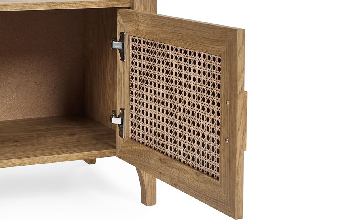 Showcasing a beautifully sleek design with a bohemian feel, the Sydney Media Unit offers exquisitely curved edging accompanied by a raised lip around the edge providing a practical addition, stunningly combined with a rattan effect front. Finished with a natural oak effect which is composed of two large storage cupboards and built-in shelving providing you plenty of space for controllers and TV monitors. All around creating the perfect airy, warm feel within your home.