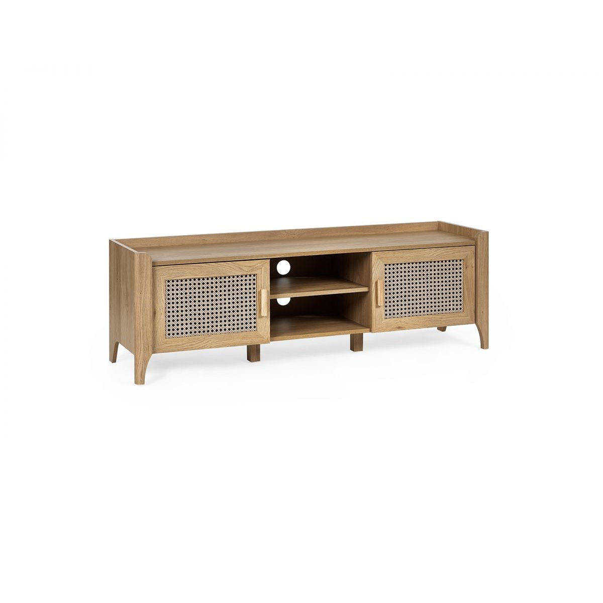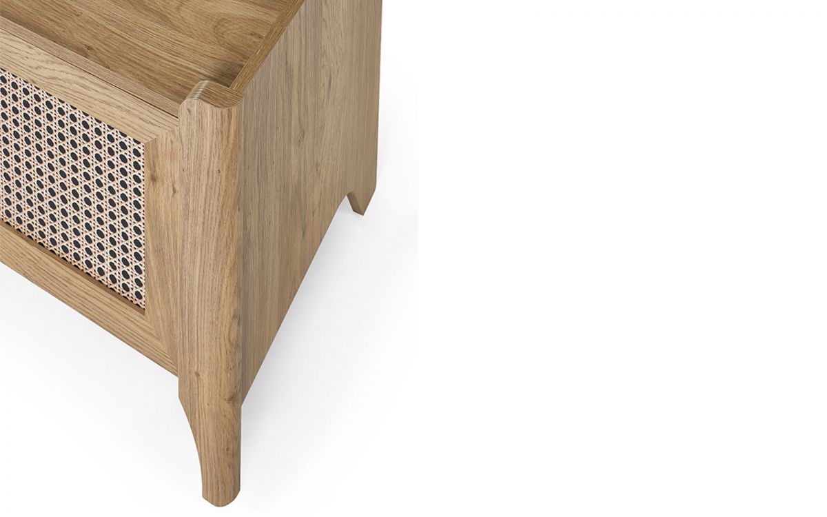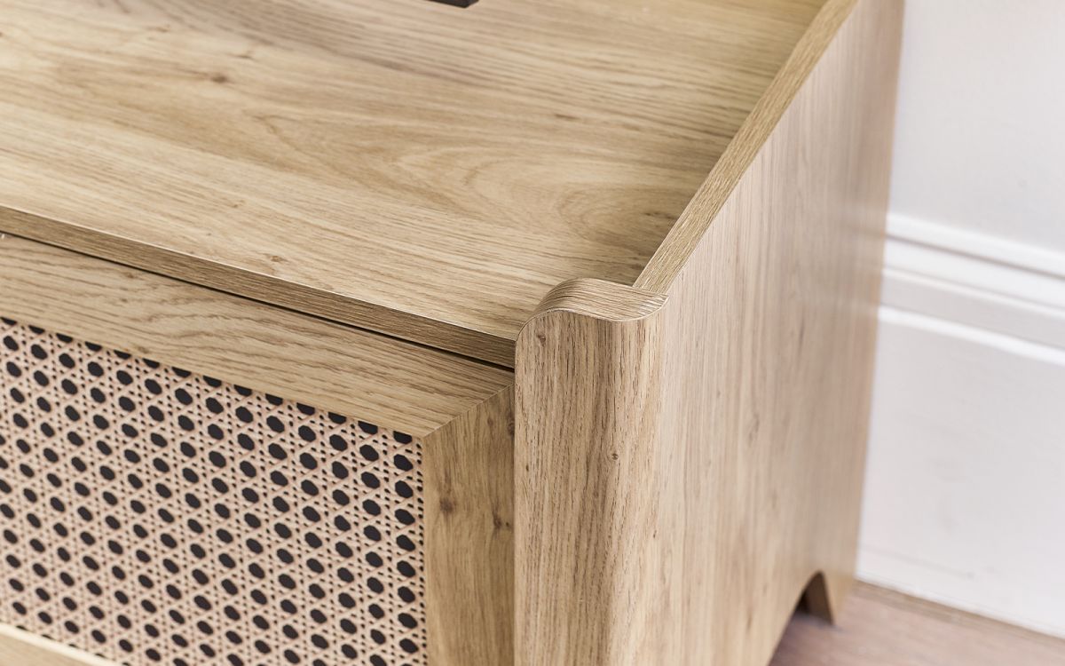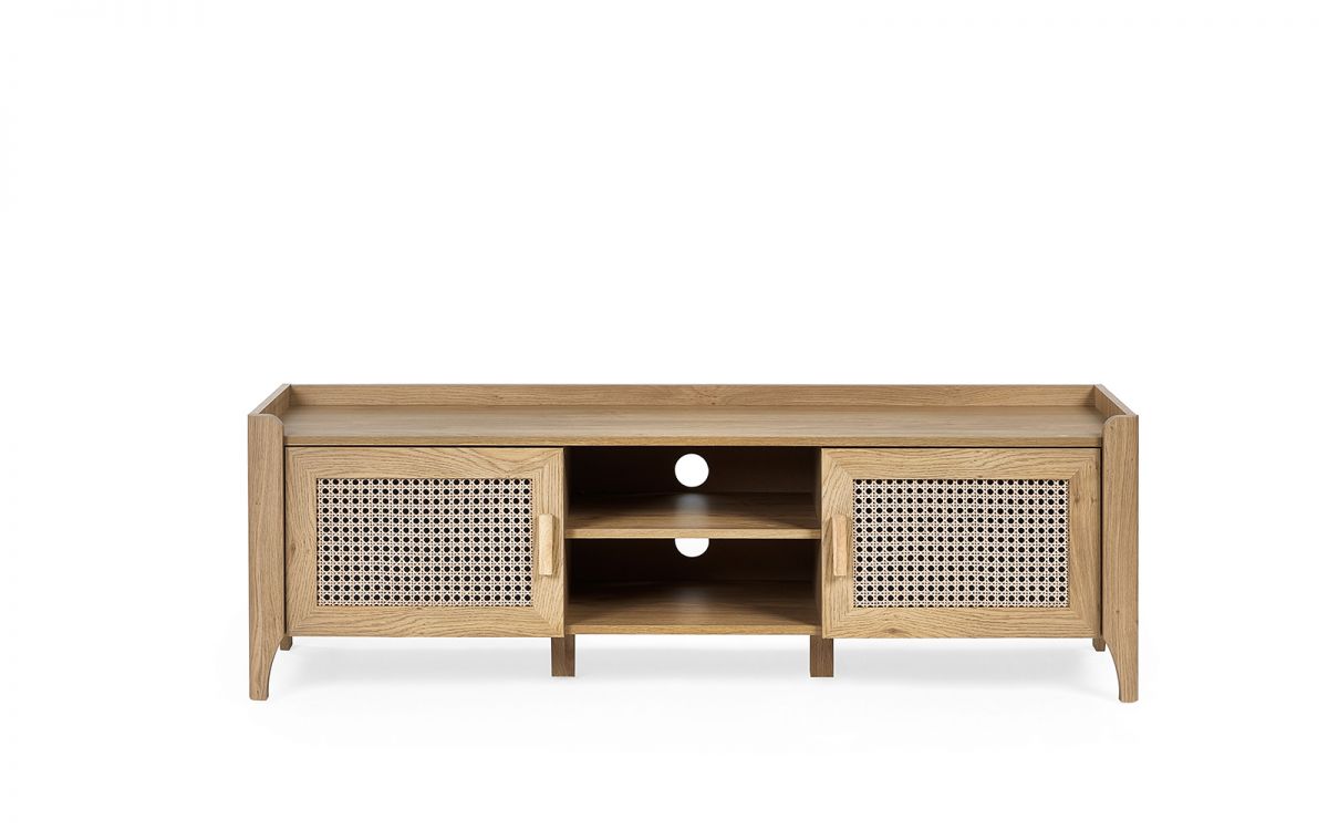 Showcasing a beautifully sleek design with a bohemian feel, the Sydney Media Unit offers exquisitely curved edging accompanied by a raised lip around the edge providing a practical addition, stunningly combined with a rattan effect front. Finished with a natural oak effect which is composed of two large storage cupboards and built-in shelving providing you plenty of space for controllers and TV monitors. All around creating the perfect airy, warm feel within your home.