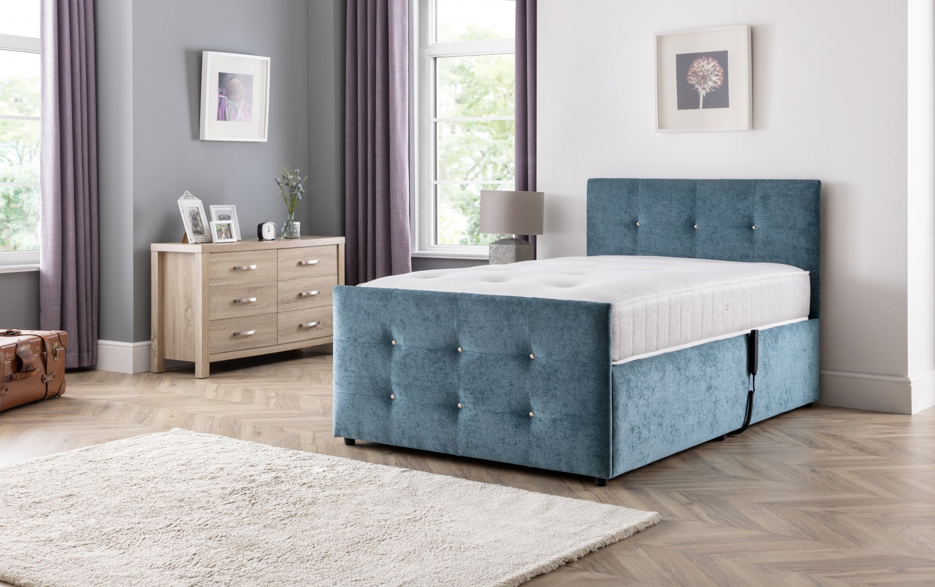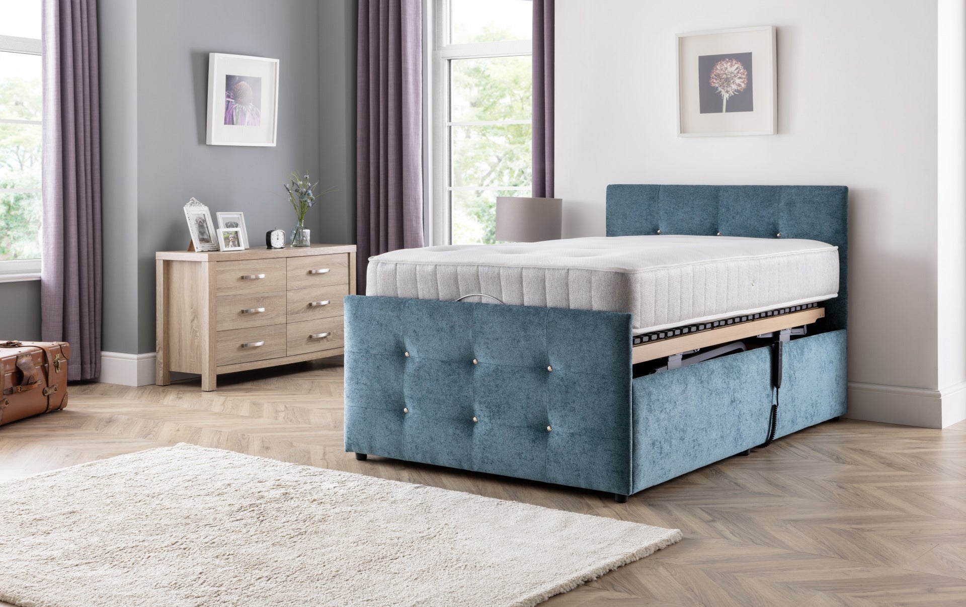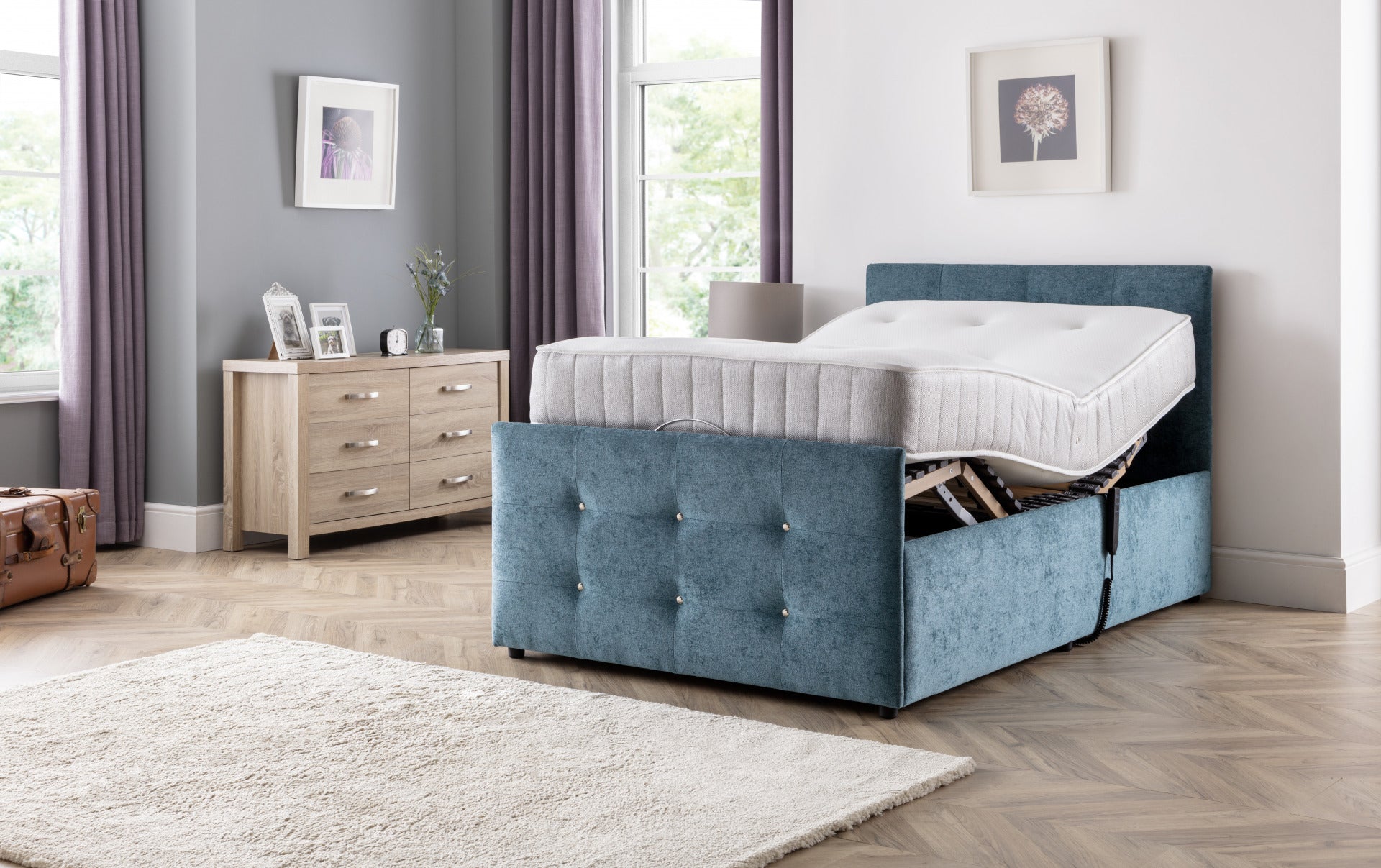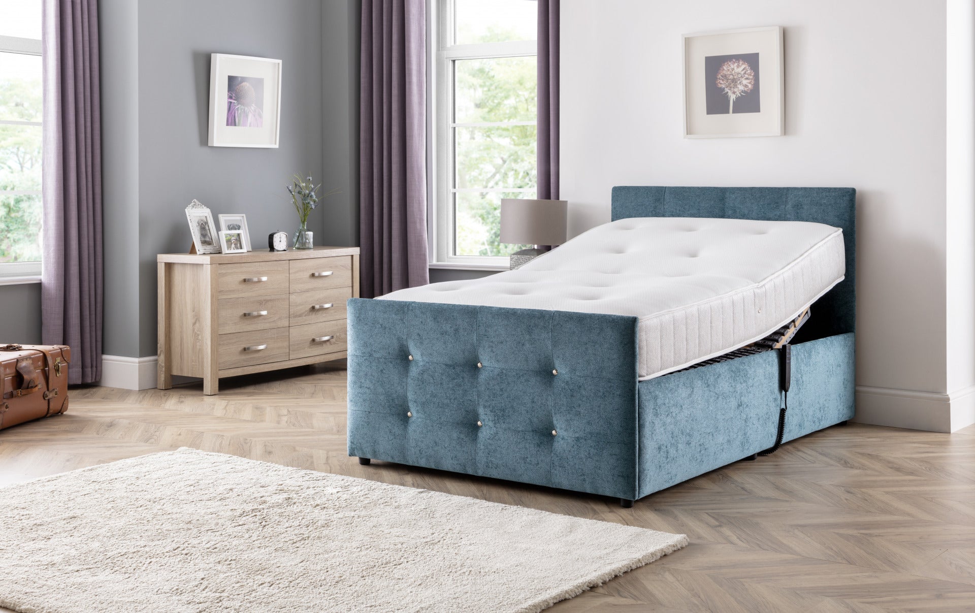 The Wiltshire features multiple benefits to help those living with conditions which affect sleep quality, from pressure relief to increased independence. For example, it’s height-adjustable bed base raises at a horizontal position to help getting in and out of bed. The Wiltshire adjustable bed features a chrome-studded head and footboard and stylish upholstery for a modern look that suits your bedroom.